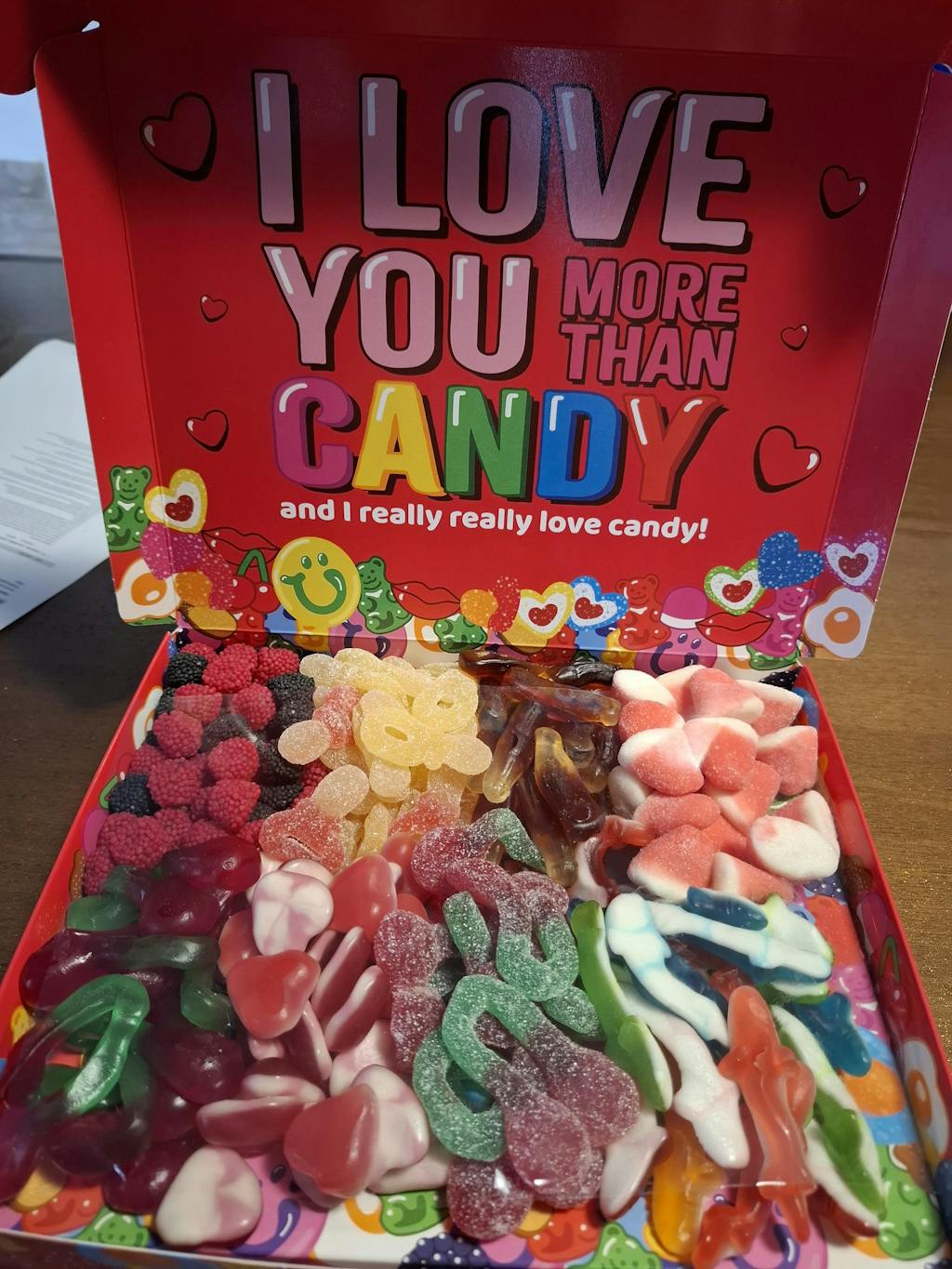 Box voll mit frizzigen Bonbons, ausgewählt für den Valentinstag. Sehr geschätztes Geschenk. Wir bestellen seit einem Jahr zu jedem Anlass eine box ☺️