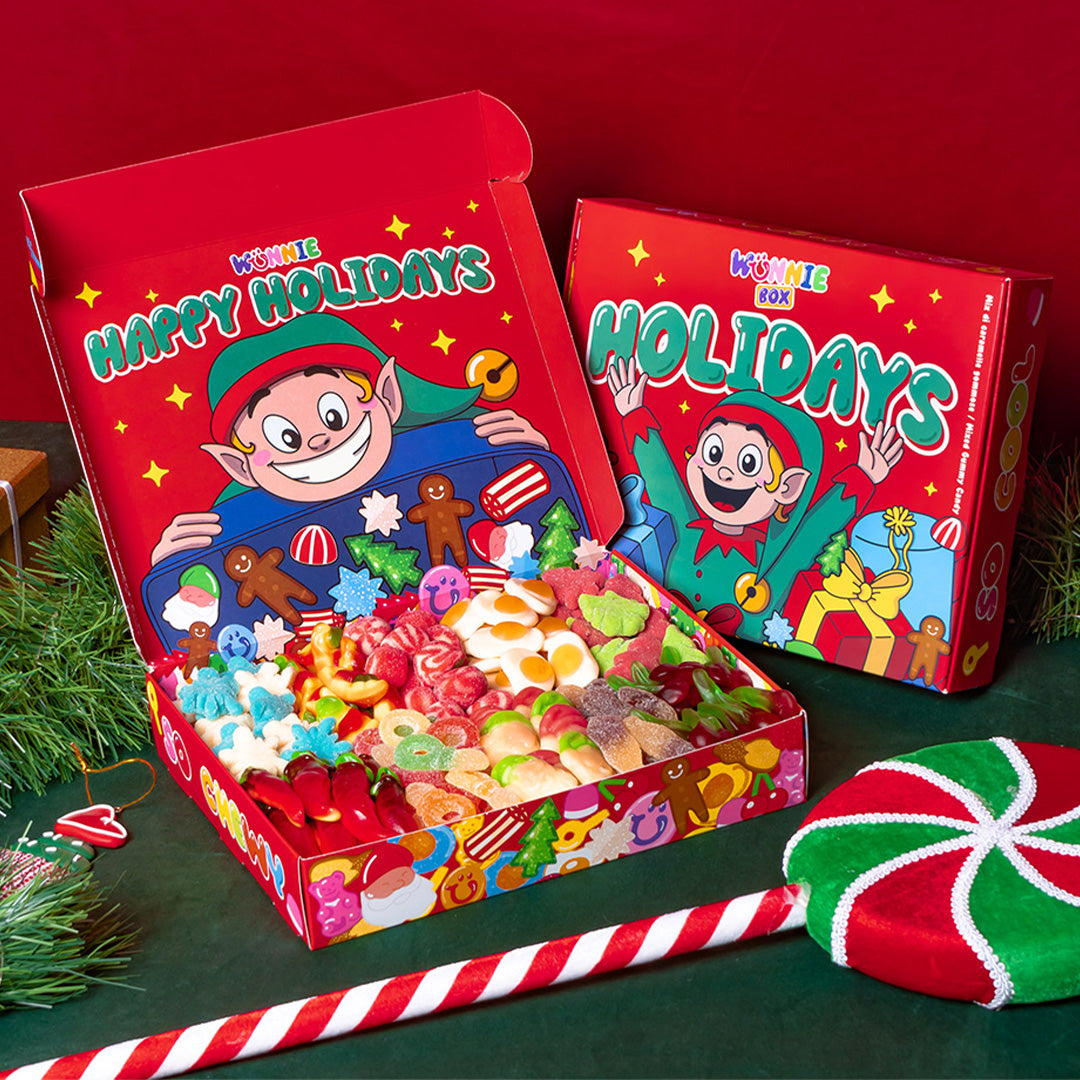 Wunnie box “Frohe Feiertage”, das Candy box zum Zusammenstellen mit deinen Lieblingsgummibärchen ab 2 kg