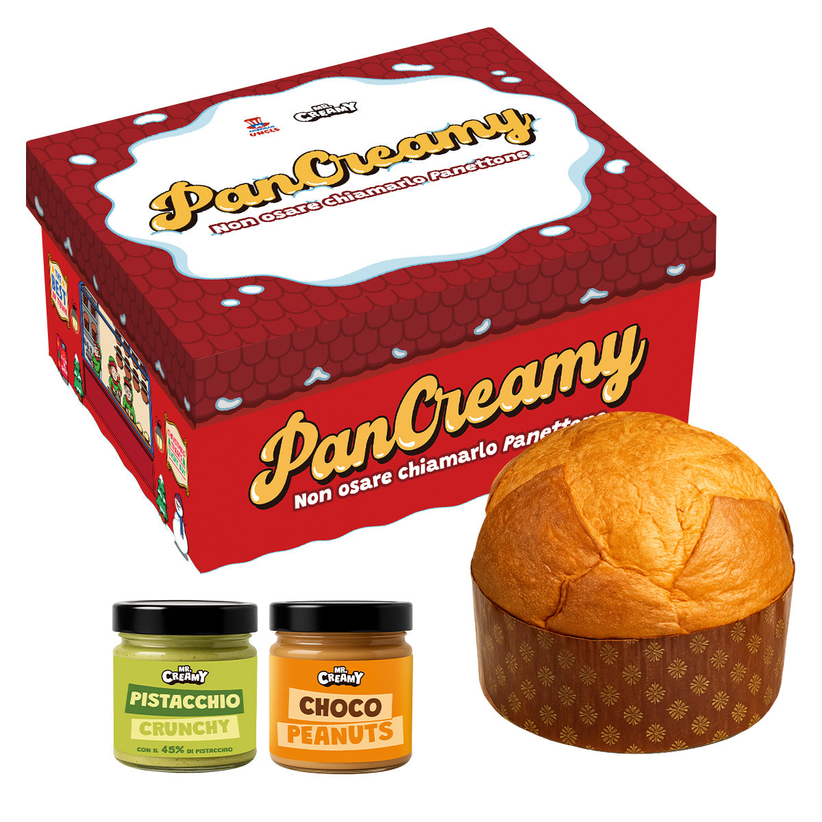 PanCreamy ist die definitive Neuinterpretation von Panettone: ein superweiches Weihnachtsdessert, das Sie schon beim ersten Bissen überzeugt! Es Panettone zu nennen wäre eine Beleidigung, PanCreamy ist viel mehr! In der Schachtel finden Sie tatsächlich zwei streichfähige Mr.Creamy-Cremes in den von Ihnen gewählten Geschmacksrichtungen!